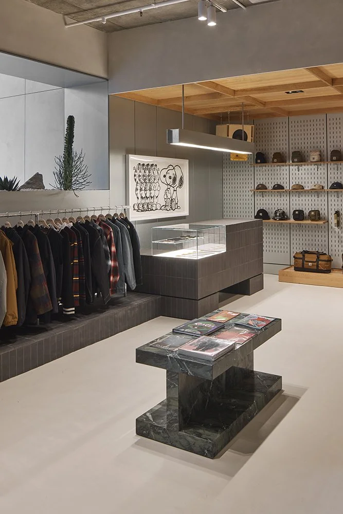 A gallery space meets retail, in a fusion showcasing local materials and youth culture.