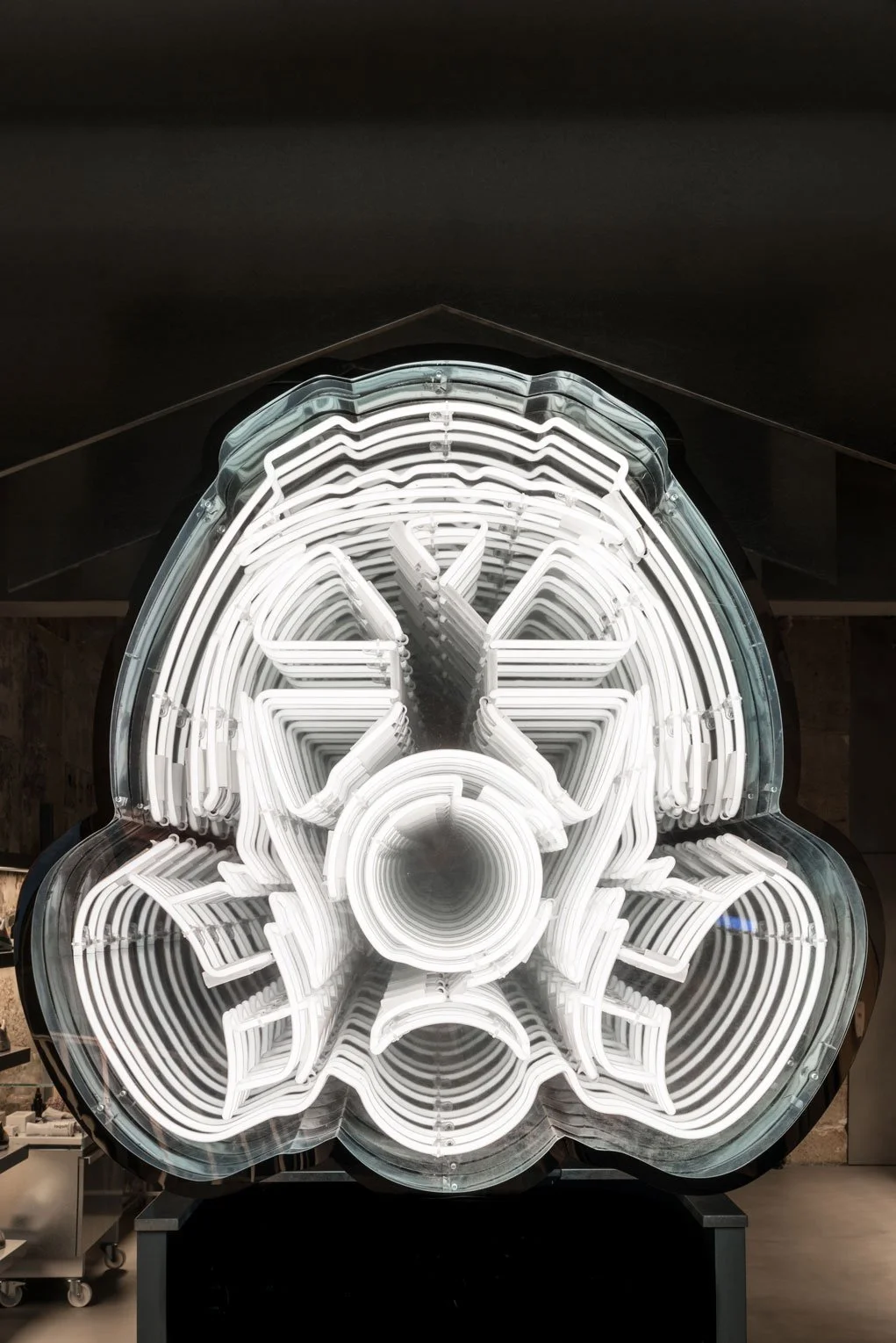To preserve continuity with the London store, we subtly reinterpret the iconic pitched-roof ‘shed’ using negative space. A series of suspended galvanised steel fins echo the original form, mirrored on the back wall to create a sense of depth and draw the customer’s eye to the focal point: the iconic Footpatrol gas mask logo.