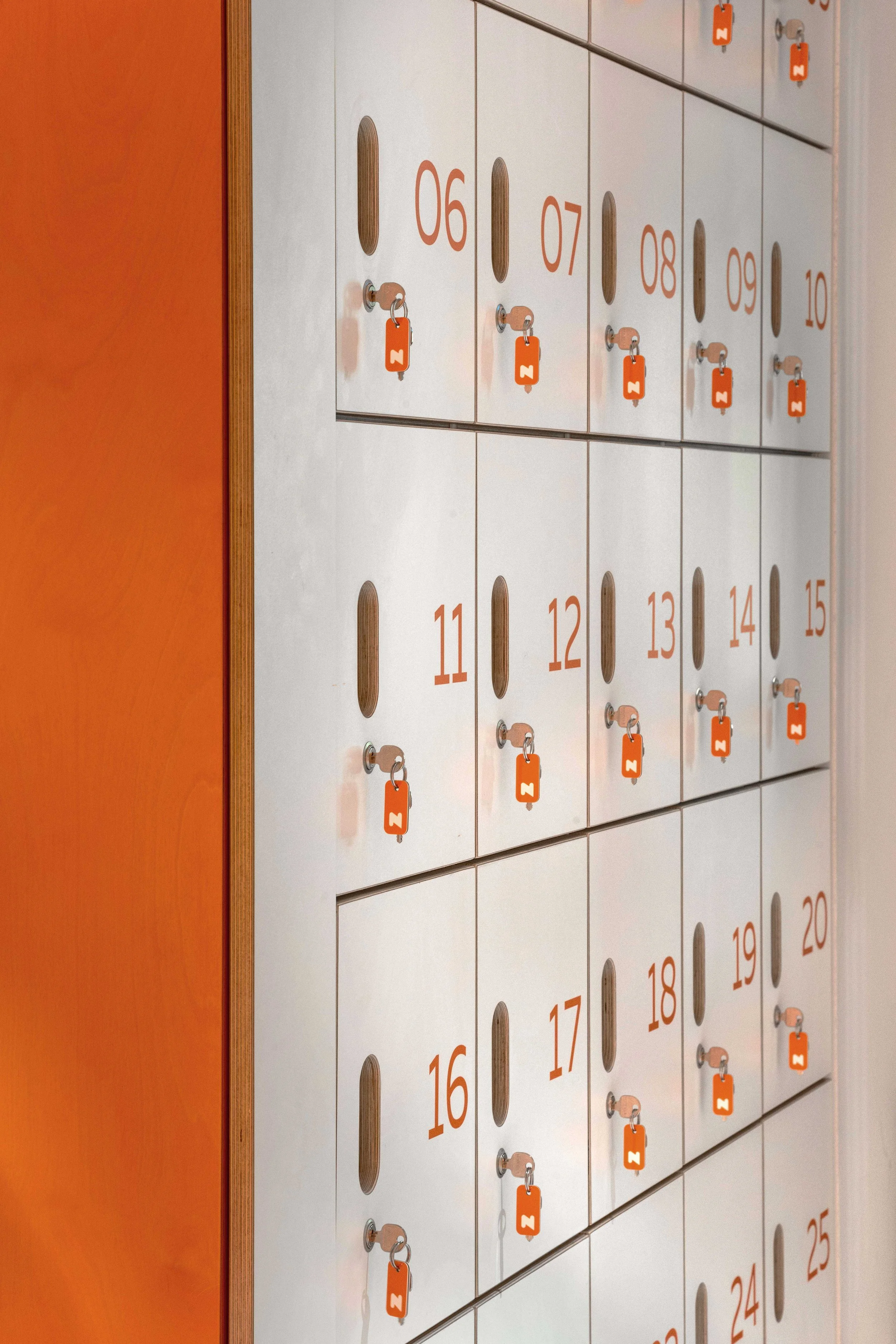 The two-storey layout separates guest-facing areas from team-only zones. On the ground floor: reception, meeting rooms, and an immersive “Pain Cave” gym with surround sound, dynamic lighting, and the Zwift platform. Locker rooms and showers nearby evoke a premium club feel.
